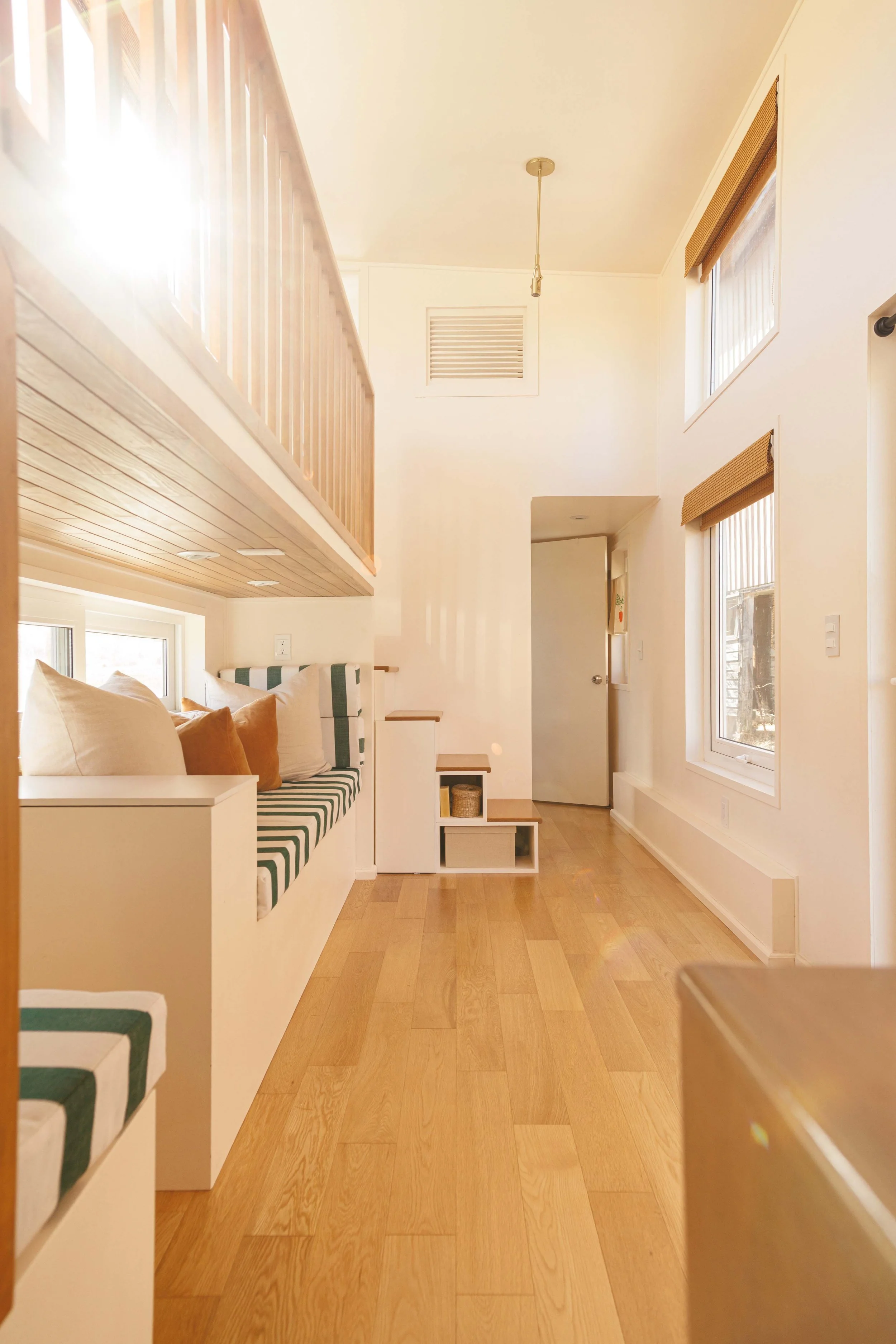 This two-bedroom tiny home has a unique “drop floor” feature that allows users to enjoy the benefits of a loft in a standing-height bedroom! Emerald green shower tiles, a custom green-and-white couch, and the natural light flooding through the transom windows will make you feel like you’re living in paradise. This home is available now in Bloomsburg, Pennsylvania!